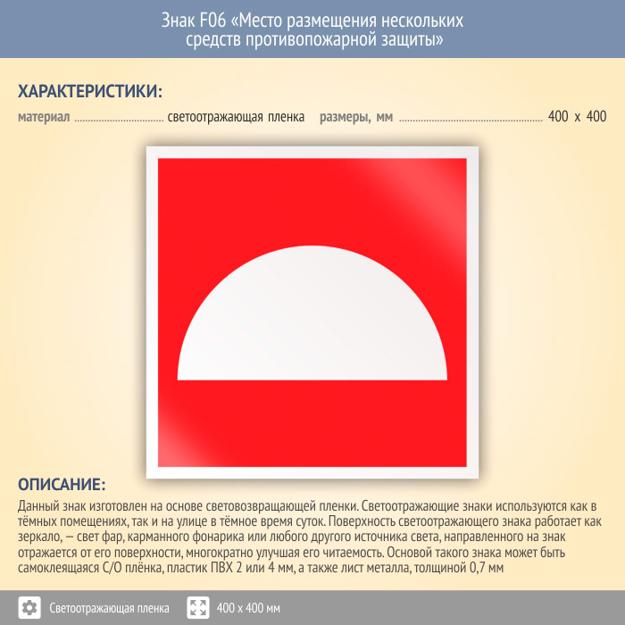 Знак F06 «Место размещения нескольких средств противопожарной защиты» (светоотражающая пленка, 400х400 мм) в Химках купить