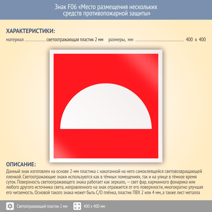 Знак F06 «Место размещения нескольких средств противопожарной защиты» (светоотражающий пластик, 400х400 мм) в Химках купить