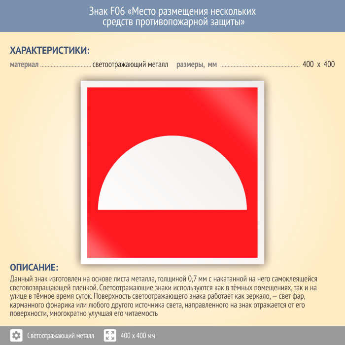 Знак F06 «Место размещения нескольких средств противопожарной защиты» (светоотражающий металл, 400х400 мм) в Химках купить