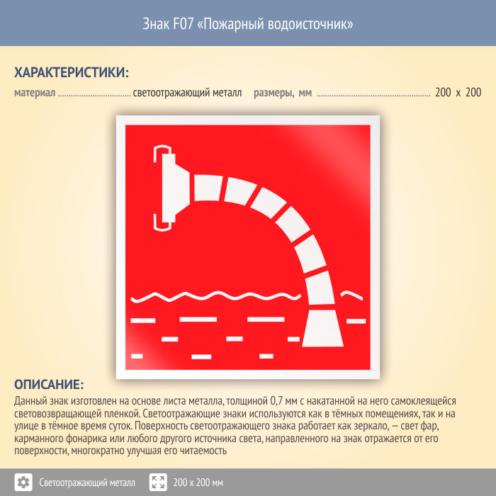 Знак F07 «Пожарный водоисточник» (светоотражающий металл, 200х200 мм) в Химках купить