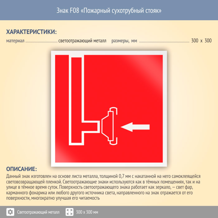 Знак F08 «Пожарный сухотрубный стояк» (светоотражающий металл, 300х300 мм) в Химках купить