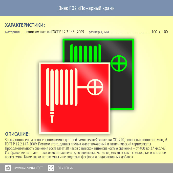Знак F02 «Пожарный кран» (фотолюминесцентная пленка ГОСТ 34428-2018, 100х100 мм) в Химках купить