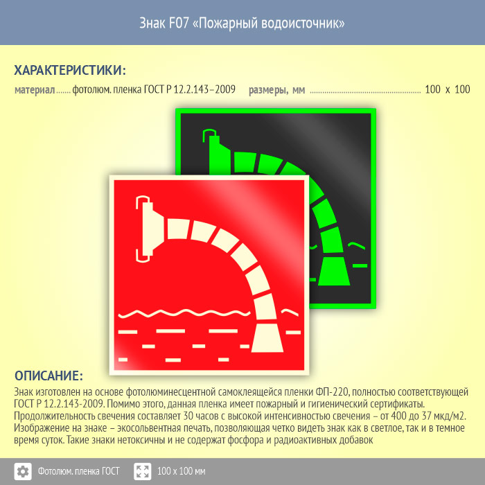 Знак F07 «Пожарный водоисточник» (фотолюминесцентная пленка ГОСТ 34428-2018, 100х100 мм) в Химках купить