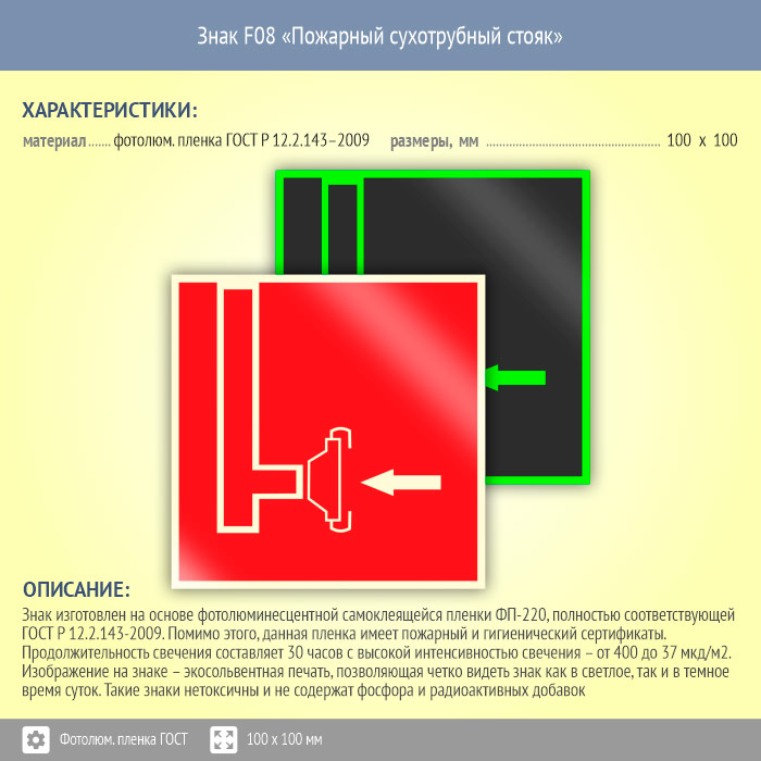 Знак F08 «Пожарный сухотрубный стояк» (фотолюминесцентная пленка ГОСТ 34428-2018, 100х100 мм) в Химках купить