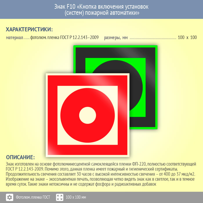Знак F10 «Кнопка включения установок (систем) пожарной автоматики» (фотолюминесцентная пленка ГОСТ 34428-2018, 100х100 мм) в Химках купить