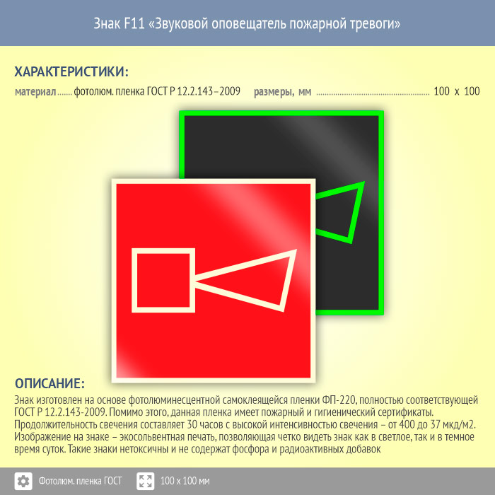 Знак F11 «Звуковой оповещатель пожарной тревоги» (фотолюминесцентная пленка ГОСТ 34428-2018, 100х100 мм) в Химках купить