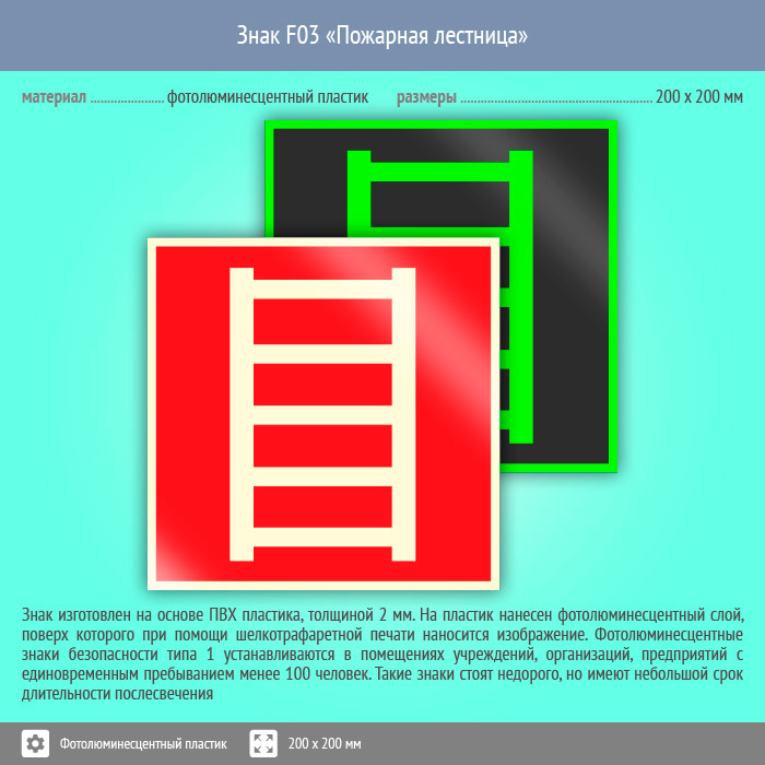 Знак F03 «Пожарная лестница» (фотолюминесцентный пластик, 200х200 мм) в Химках купить
