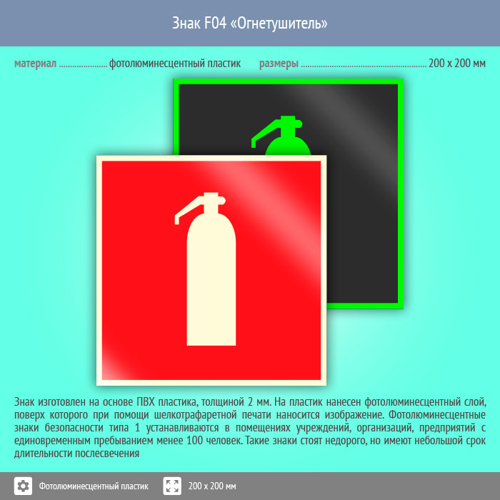 Знак F04 «Огнетушитель» (фотолюминесцентный пластик, 200х200 мм) в Химках купить