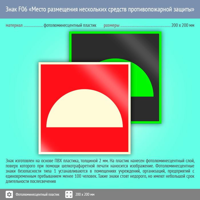 Знак F06 «Место размещения нескольких средств противопожарной защиты» (фотолюминесцентный пластик, 200х200 мм) в Химках купить