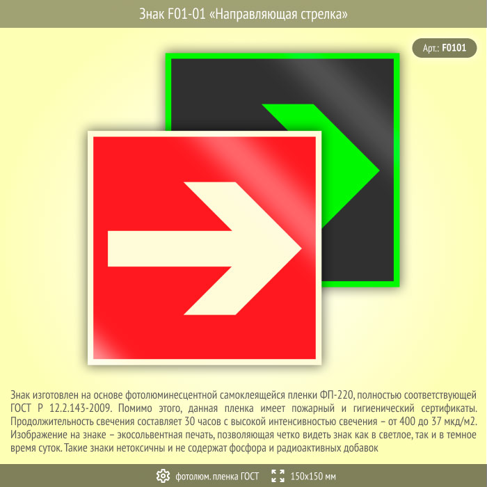 Знак F01-01 «Направляющая стрелка» (фотолюминесцентная пленка ГОСТ 34428-2018, 150х150 мм) в Химках купить