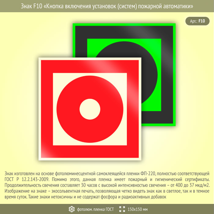 Знак F10 «Кнопка включения установок (систем) пожарной автоматики» (фотолюминесцентная пленка ГОСТ 34428-2018, 150х150 мм) в Химках купить