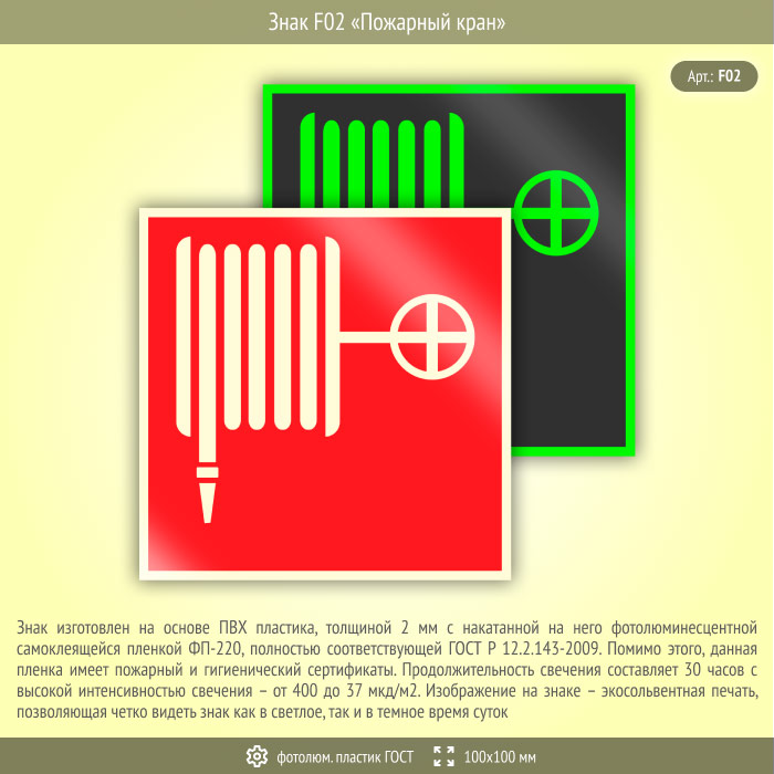 Знак F02 «Пожарный кран» (фотолюминесцентный пластик ГОСТ 34428-2018, 100х100 мм) в Химках купить