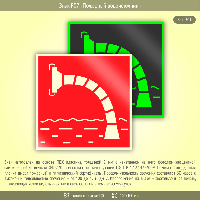 Знак F07 «Пожарный водоисточник» (фотолюминесцентный пластик ГОСТ 34428-2018, 100х100 мм) в Химках купить