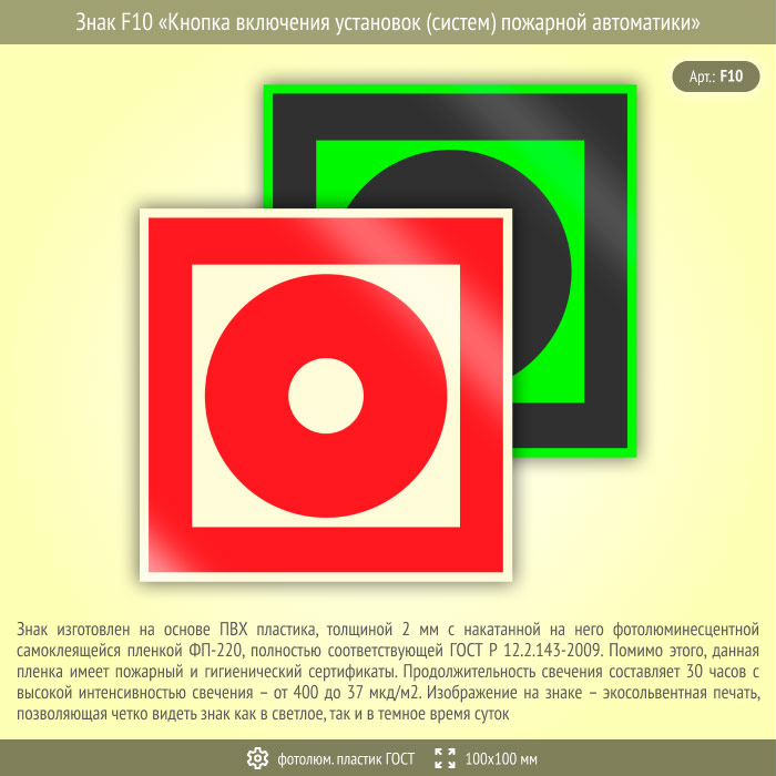 Знак F10 «Кнопка включения установок (систем) пожарной автоматики» (фотолюминесцентный пластик ГОСТ 34428-2018, 100х100 мм) в Химках купить