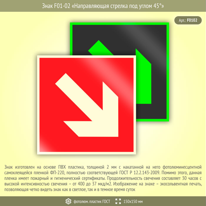 Знак F01-02 «Направляющая стрелка под углом 45°» (фотолюминесцентный пластик ГОСТ 34428-2018, 150х150 мм) в Химках купить
