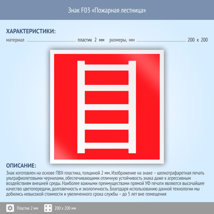 Знак F03 «Пожарная лестница» (пластик, 200х200 мм) в Химках купить