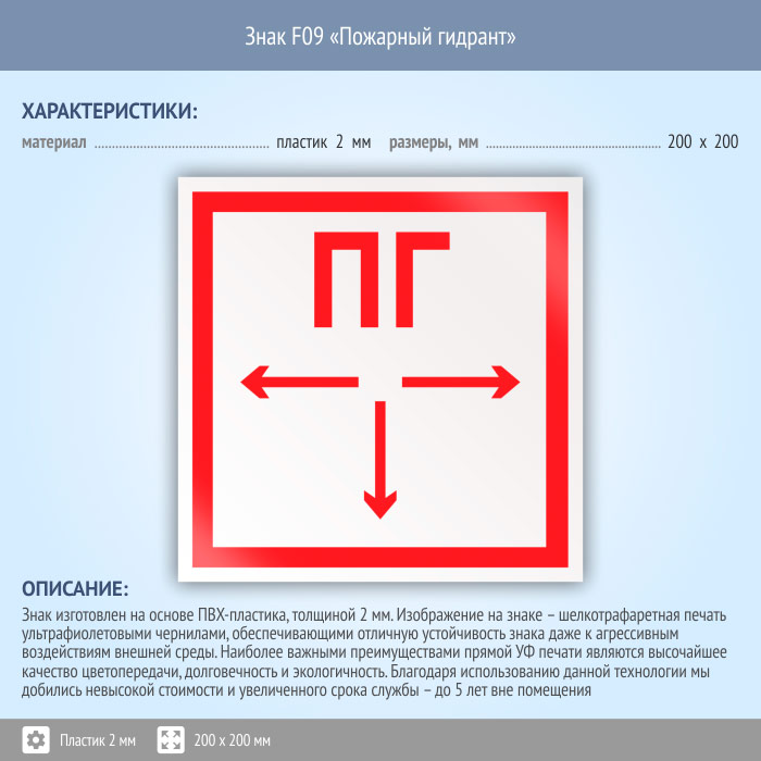 Знак F09 «Пожарный гидрант» (пластик, 200х200 мм) в Химках купить