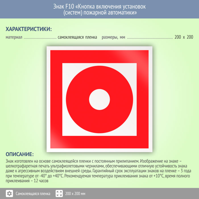 Знак F10 «Кнопка включения установок (систем) пожарной автоматики» (пленка, 200х200 мм) в Химках купить
