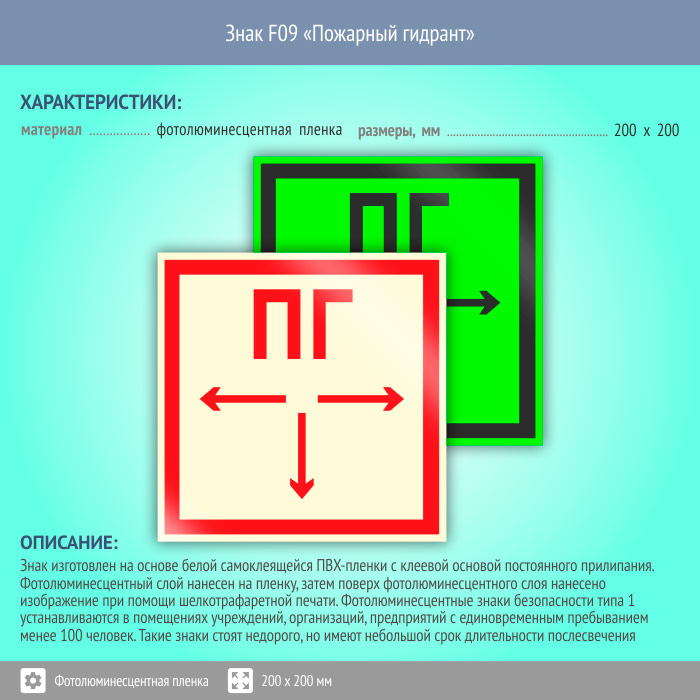 Знак F09 «Пожарный гидрант» (фотолюминесцентная пленка, 200х200 мм) в Химках купить