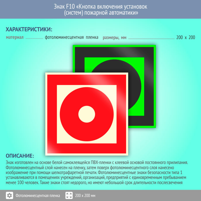 Знак F10 «Кнопка включения установок (систем) пожарной автоматики» (фотолюминесцентная пленка, 200х200 мм) в Химках купить