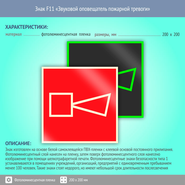 Знак F11 «Звуковой оповещатель пожарной тревоги» (фотолюминесцентная пленка, 200х200 мм) в Химках купить