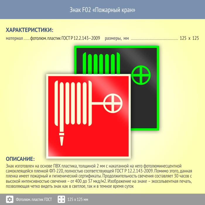 Знак F02 «Пожарный кран» (фотолюминесцентный пластик ГОСТ 34428-2018, 125х125 мм) в Химках купить